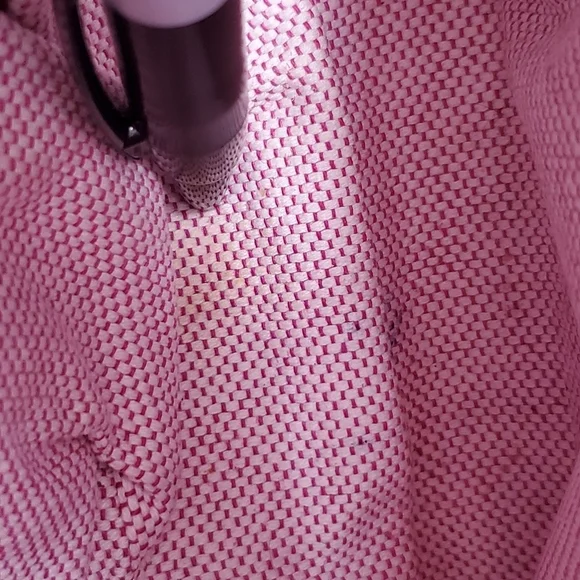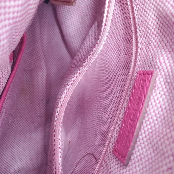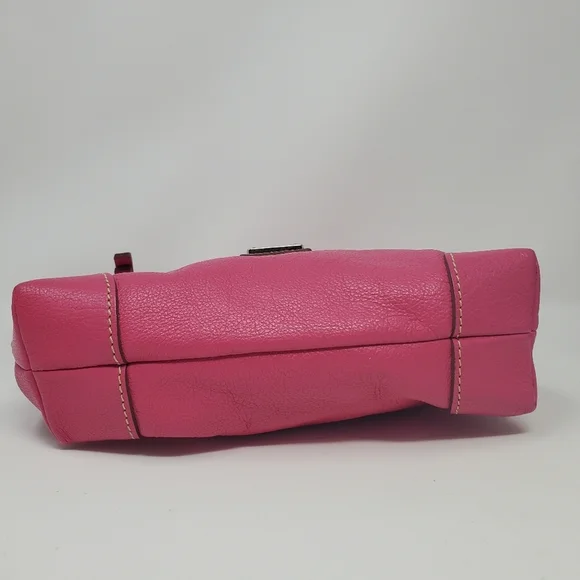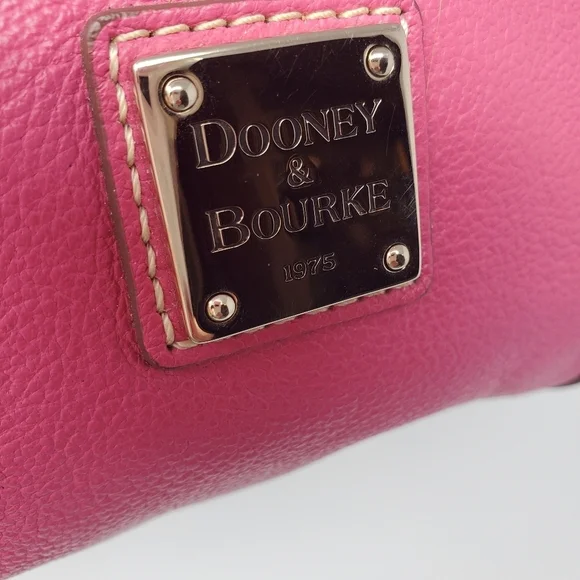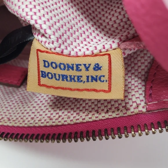 Dooney & Bourke handbag.Pebble grain leather in fuschia.Interior pink and white stripes.Silver colored hardware.Some wear on the hardware by the straps as pictured.Some light scratching on the hardware where logo is as pictured (difficult to see).Some peeling on material as pictured.A light spot of discoloration as pictured.It is preowned, but in good, usable condition.Approximate measurements:L: 6"W: 9"Offers are welcome! Will accept or counter offer!Will be packaged with careShips on Mondays and Fridays
