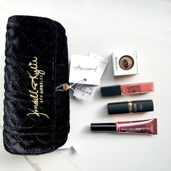 *** Kendall + Kylie Black Fold Over Pouch with Brush Organizer Stylish Makeup Bag. *** Covergirl Vitalist Healthy Glow Highlighter #5 Sundown.7g(.24 Oz).*** L’Oréal infallible paints/ metallic #330 moon lust 8ml.*** Maybelline Vivid Matte Liquid Lipstick #10 NUDE FLUSH7.7 ml.*** L'Oreal Paris Color Riche Collection Exclusive Lipstick, 630 Liya's Nude,3.6g.